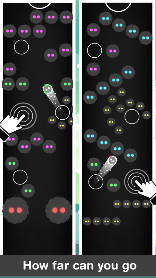 3、你需要操控自己的角色移动,通过白色圆圈区域,躲避紫色眼睛的敌人,顺利完成关卡任务。