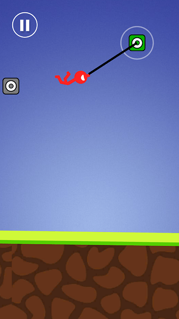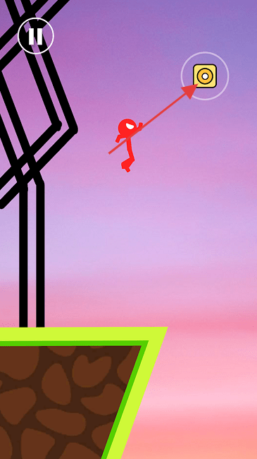 2、玩家需精准瞄准目标点发射绳索,控制小人的移动轨迹,避开黑色的危险障碍物,确保顺利前进。
