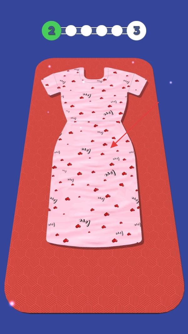 2、在服装关卡里,依据箭头指向对粉色带爱心图案裙子等进行操作,根据进度标识完成服装任务推进游戏。
