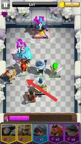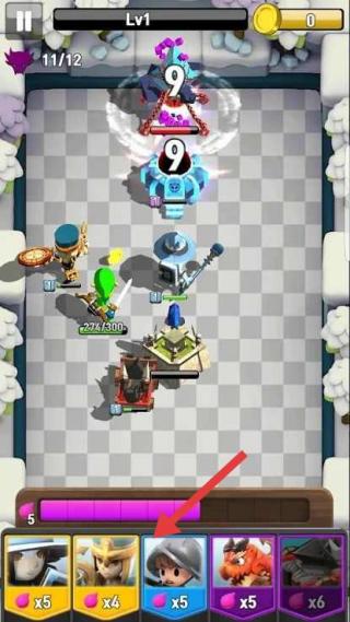 2、进入战斗场景,观察战场局势,适时点击下方卡牌召唤角色,投入战斗。