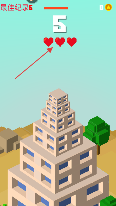 2、游戏中叠加楼层,上方爱心代表可以失误次数,需保持楼层整齐以延续游戏。
