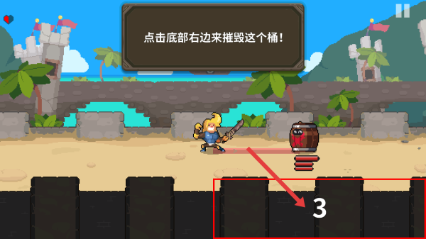 3、当出现可互动物品(如木桶)时,按照提示点击底部右边对应位置,摧毁木桶,推进游戏进程。