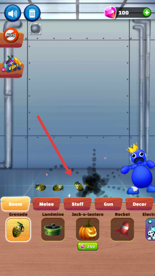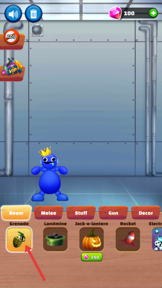 1、在游戏界面中点击“Boom”分类下的“Grenade”(手榴弹)图标,向蓝色角色附近投掷手榴弹,制造爆炸效果。