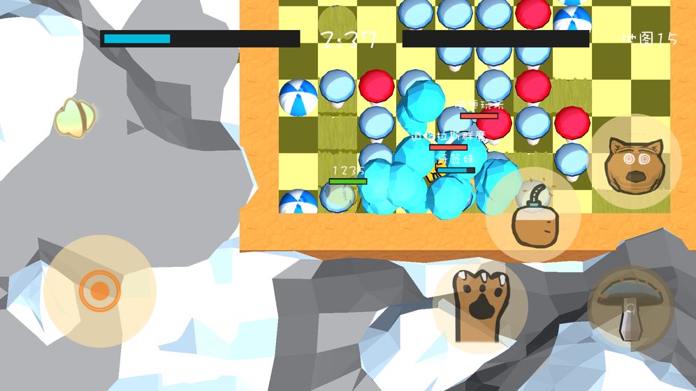 1、分数争夺规则简明:以分数条先充满为获胜条件,通过蓝蘑菇围杀红蘑菇引发爆炸转化分数,规则简单易懂却考验临场策略,玩家需快速判断局势,选择围杀时机与目标。