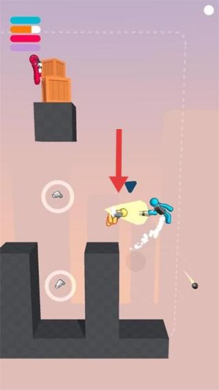 1、操控角色利用喷气装置腾空,按箭头方向朝目标方块移动,躲避其他角色攻击。