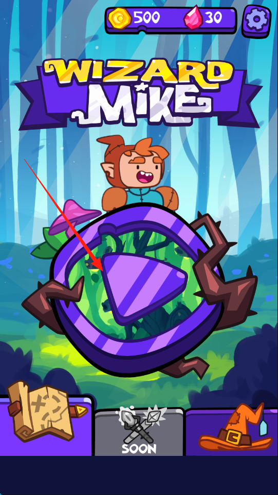 1、打开巫师迈克界面,点击紫色播放按钮,进入游戏世界,开启魔法冒险之旅。