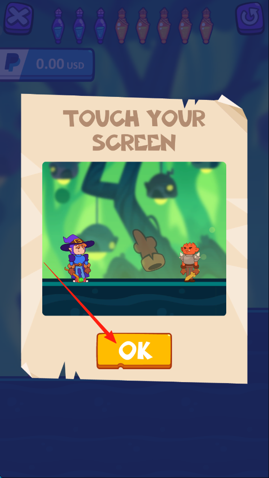 2、看到触摸你的屏幕提示后,点击OK按钮,确认操作提示,继续游戏进程。