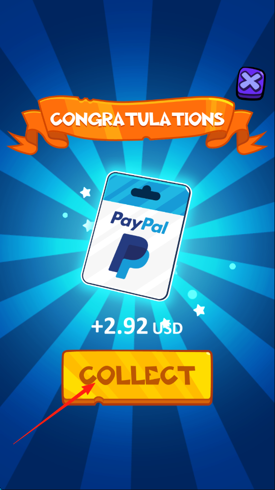 3、获得奖励界面,点击COLLECT按钮,领取PayPal的二点九二美元奖励。