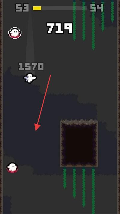 1、玩家在像素风格的暗黑场景中,操控角色踩踏攻击白色幽灵怪物,消除怪物以推进游戏。