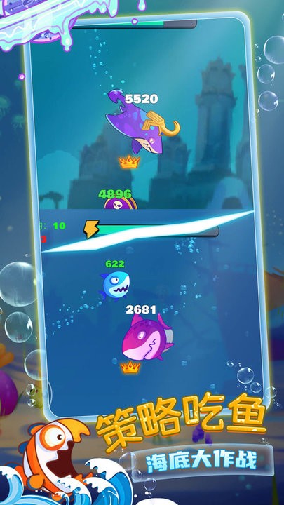 2、存在不同分数和体型的鱼,玩家需运用策略,既要捕食小鱼提升实力,又要躲避比自己强大的鱼。