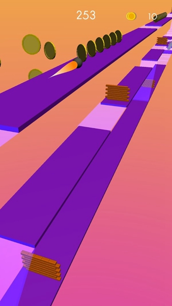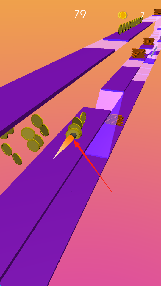 2、操控小球在紫色轨道前进时,收集沿途金币,获取分数和资源,提升游戏成绩。