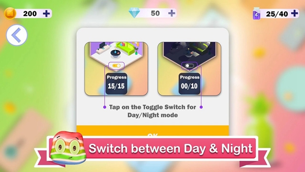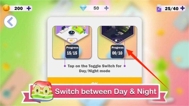 2、在游戏界面,查看金币、钻石数量和关卡进度,点击场景切换按钮,体验不同环境模式。