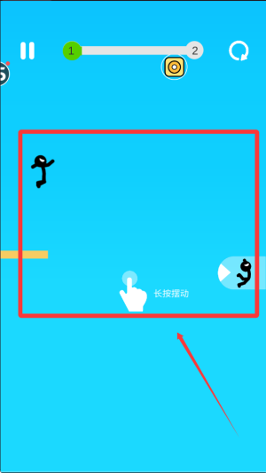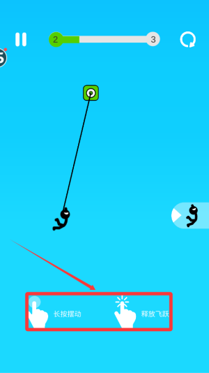 1、玩家按下屏幕施放抓钩,钩住屏幕中的吊索,火柴人会依据吊索和勾线角度自由摆动。
