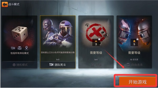 1、进入游戏后选择适合自己的战斗模式,点击右下角开始游戏开始。