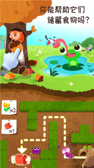 1、作为儿童科普游戏,孩子能在家探索小动物过冬的秘密,轻松在家学习百科知识,不受时间和空间限制。