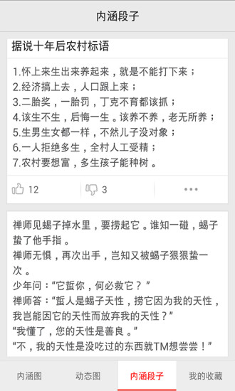 内涵图片app为您精选网络上最新的内涵段子和内涵图片可以观看,你可以在这里轻松的找到许多的欢乐如果你看到自己觉得非常有趣味的段子还可以一键分享到qq空间、微博、人人网中与自己的好友一起观看哦。