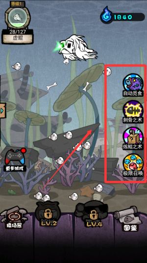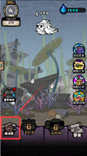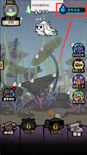 3、当进化的点数达到满格状态,玩家点击左上角按钮,就能让鲲成功进阶,实现实力提升,之后再重复捕食、积累、进阶的过程。