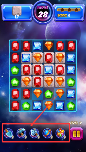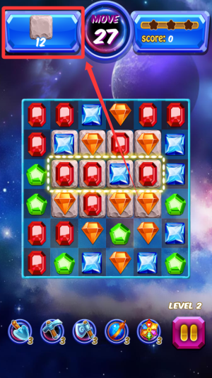 4、匹配5个宝石排成一列,可打造特殊颜色的珠宝明星,它可以摧毁同样的所有珠宝,助力玩家过关。