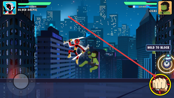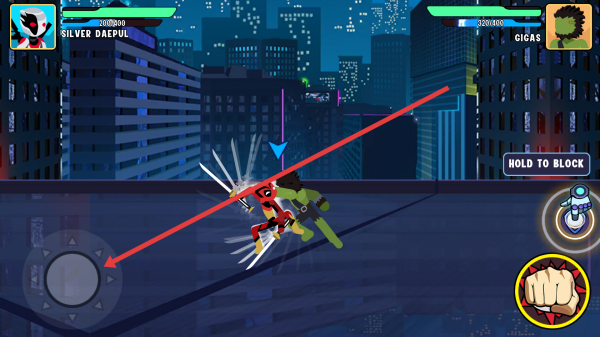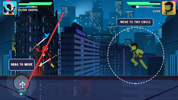 2、游戏中按照箭头方向(如红色箭头所示)操控角色(左侧红色忍者形象“Silver Daepul”),通过左下角虚拟摇杆(“DRAG TO MOVE”提示)。