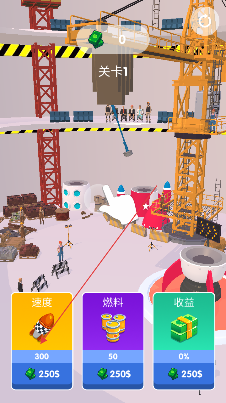 1、游戏初始界面有关卡提示(如关卡1),下方“速度”“燃料”“收益”等选项标有数值及购买费用(如速度300,250$)。