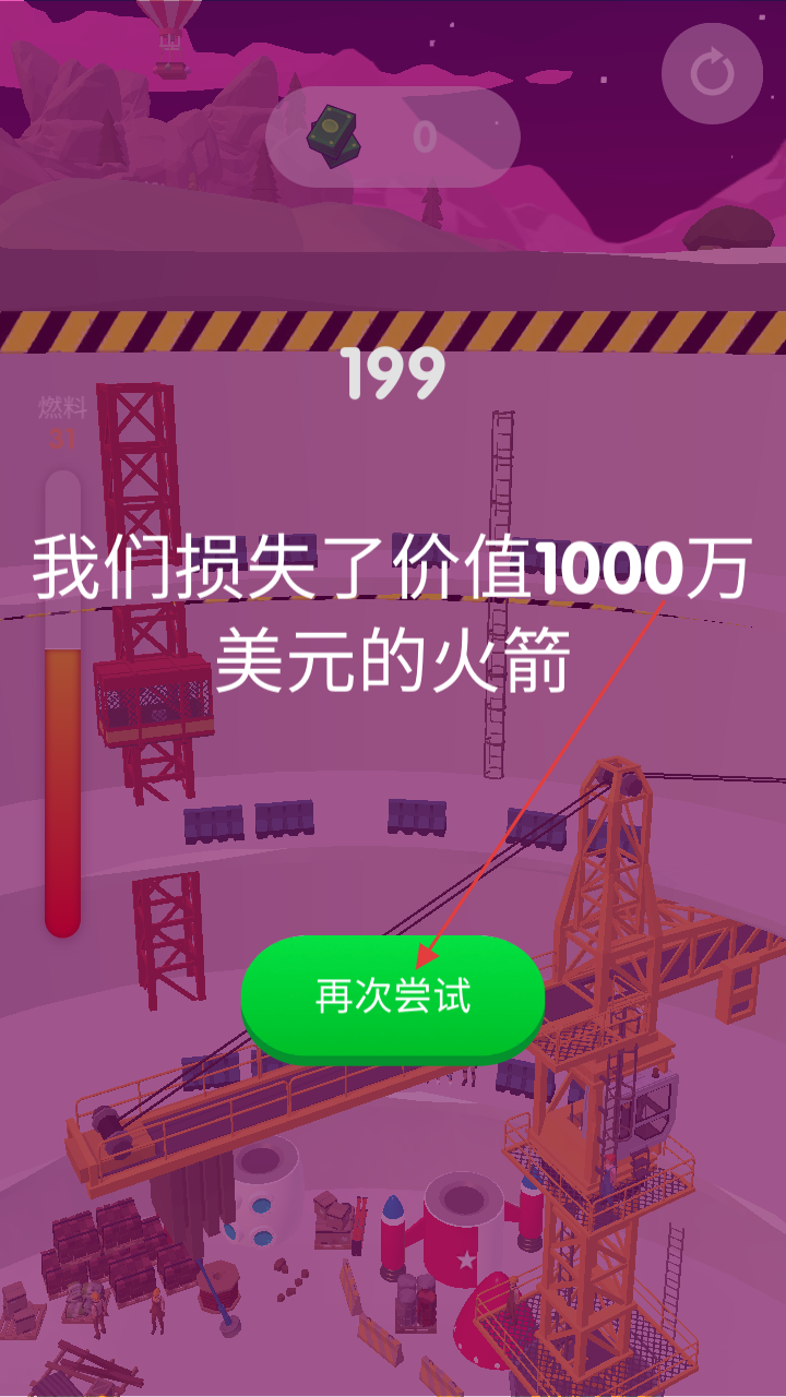3、若火箭发射等环节失败(如提示“我们损失了价值1000万美元的火箭”),可点击“再次尝试”按钮重新开始关卡。