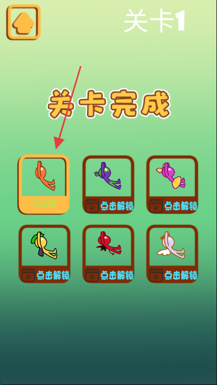 2、关卡1完成后,界面显示已选角色,可点击其他角色的【点击解锁】按钮,解锁新角色。