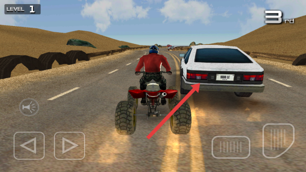 3、在赛道上遇到【白色汽车】等其他的车辆,需要操控ATV灵活避让或超越,顺利推进比赛。