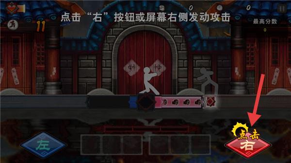 2、进入游戏战斗场景,根据提示,点击“右”按钮或屏幕右侧,操控角色发动攻击,击打敌人。