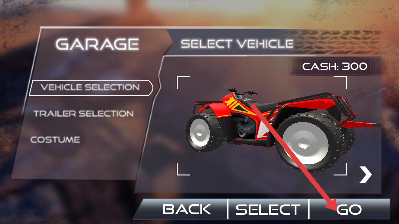 2、在四人ATV车手的车库选好车辆后,点击【GO】,即可进入游戏场景,开始越野之旅。