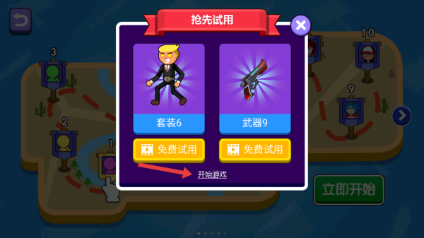 2、遇到“抢先试用”弹窗时,若不想试用套装或武器,点击【开始游戏】按钮,进入游戏关卡。