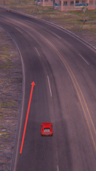 2、进入驾驶场景后,按照红色箭头指示方向,操控车辆沿道路直线行驶。
