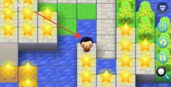 2、在游戏关卡中,操控角色(如箭头所指)移动,收集场景中的星星道具,注意避开障碍物。