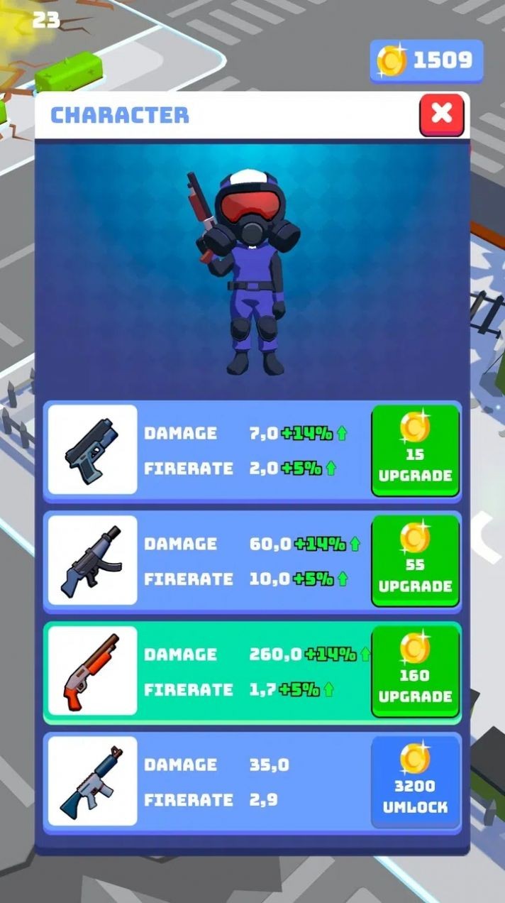 3、玩家可消耗金币升级武器,提升伤害与射速等属性,界面展示多种枪械,不同武器有不同升级成本与属性成长,需策略分配金币打造强力武器库。
