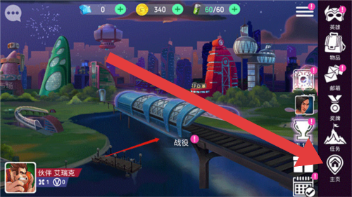 1、进入游戏主界面(第一张图),点击右侧“主页”按钮(箭头指向),可返回主界面查看整体地图。