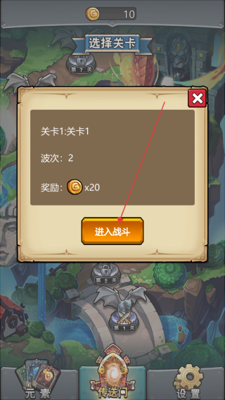 2、点击“第1关”后,弹出信息框显示关卡信息,其中波次为2,奖励为金币20,此时点击“进入战斗”按钮,正式进入关卡战斗环节。