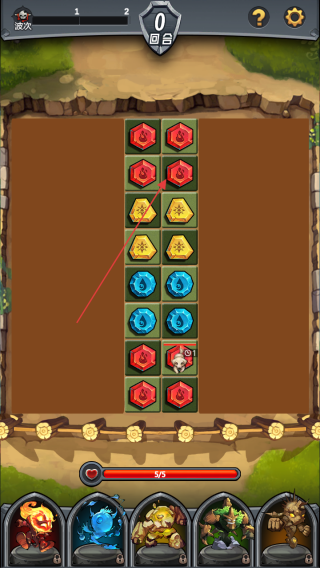 3、进入战斗后,游戏界面出现元素方块阵列,上方显示波次和回合数,下方有生命值进度条及角色卡牌。