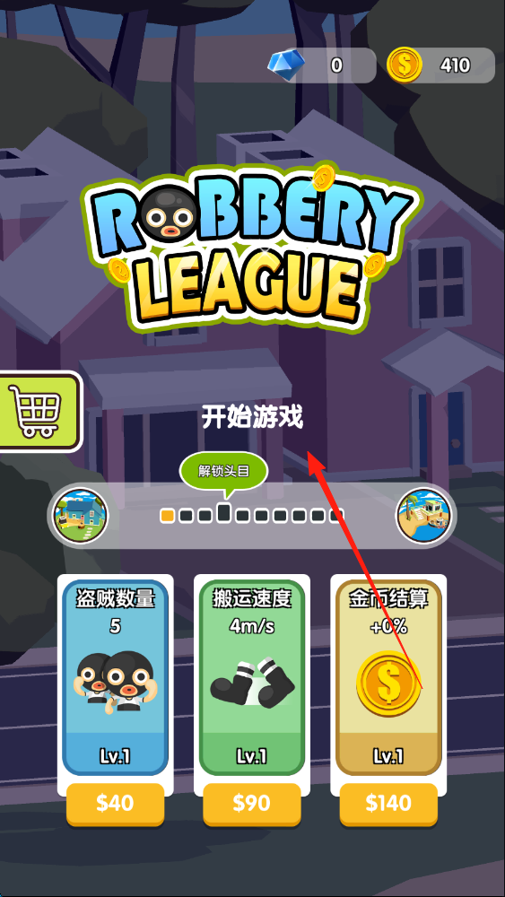 1、点击抢劫获取:点击屏幕操控强盗移动,靠近目标物品完成抢劫,通过持续抢劫积累金钱,为升级和招募伙伴奠定基础。