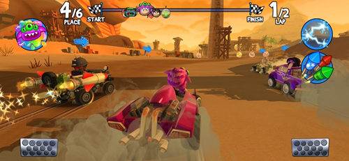 3、庞大的车库与角色的阵容:收录沙滩车、巨轮卡车、方程式赛车等40+车型,经典车款如“火焰沙滩车”焕新回归,新增“机甲卡车”“悬浮赛车”等未来科技车型。