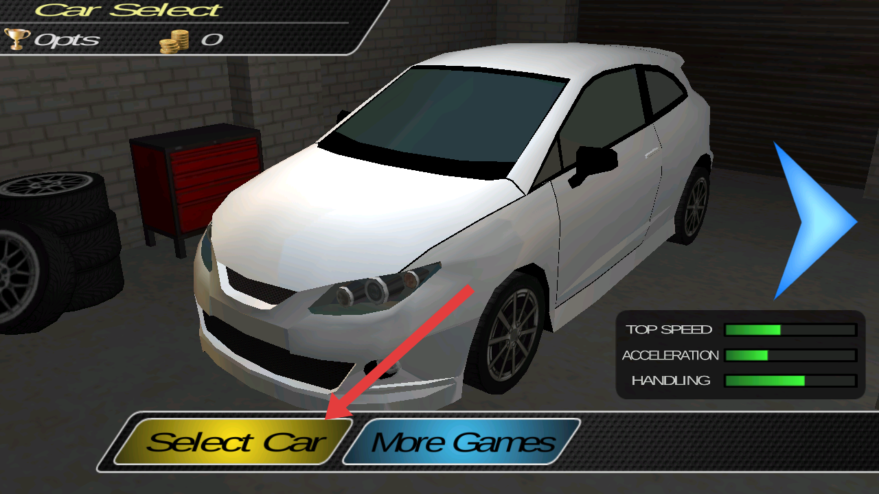 2、在车辆选择界面,查看车辆属性(如TOP SPEED等),点击【Select Car】选择合适赛车,为比赛做准备。
