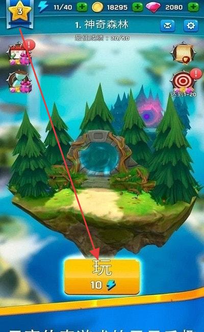 1、在神奇森林关卡界面,点击【玩】按钮,消耗10点能量进入游戏,努力达成【最低成绩:20/50】目标。