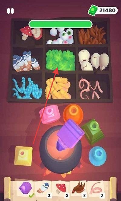 2、物品收集与合成玩,并可在下方坩埚处进行合成操作,进度条显示任务完成进度,完成可获大量金币。