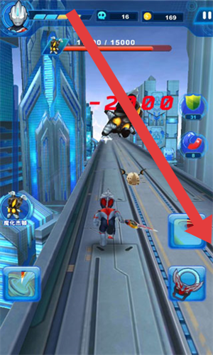 2、跑酷射击与技能释放:在跑酷过程中滑动屏幕操控奥特曼砍杀怪物,适时释放专属技能与终极大招,通过灵活操作躲避障碍并消灭沿途敌人。