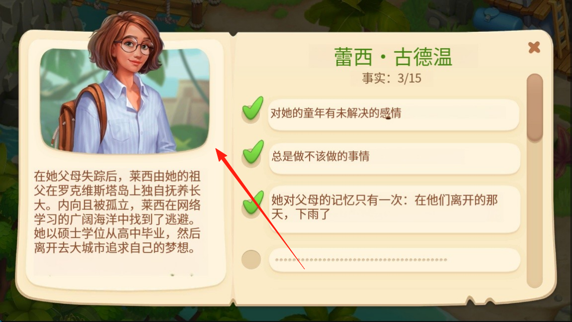 1、查看“蕾西古德温”角色信息,了解其背景故事,知晓已解锁和待解锁事实内容。