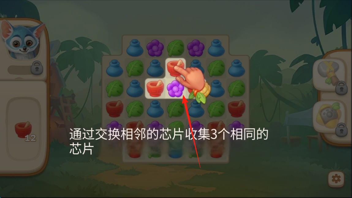 2、在消除关卡中,依据“通过交换相邻的芯片收集3个相同的芯片”提示,进行消除操作。