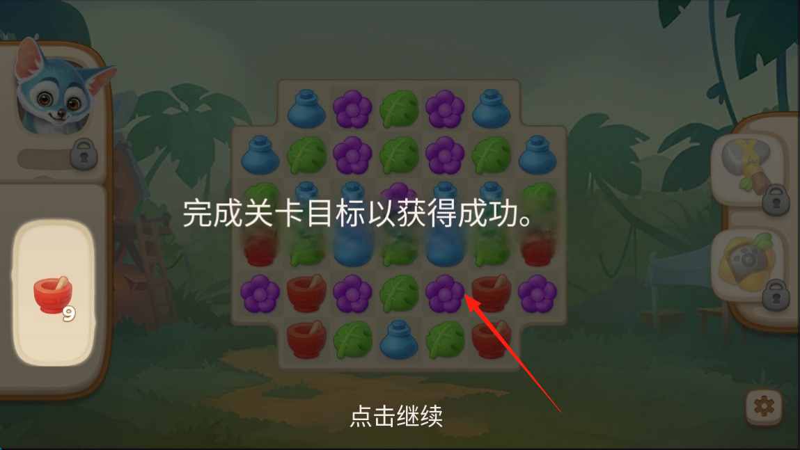 3、持续交换消除芯片,完成关卡目标,如收集指定数量物品,点击“点击继续”推进游戏。