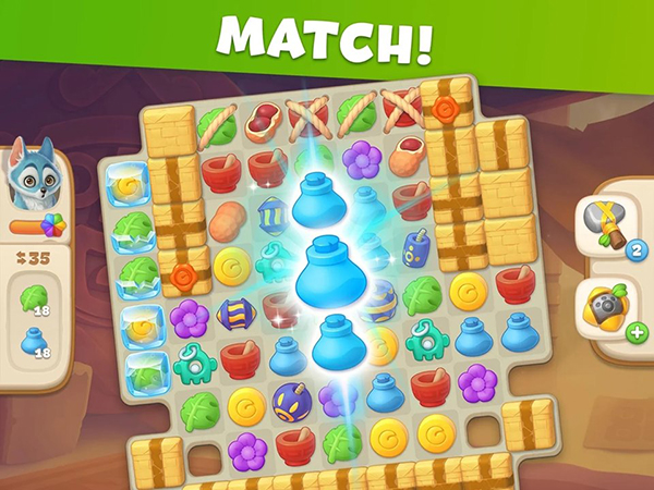 1、三消关卡挑战:在各关卡中通过消除古老宝石完成任务,触发特殊效果突破障碍,获取道具助力莱西应对冒险中的困难。