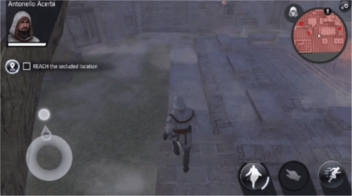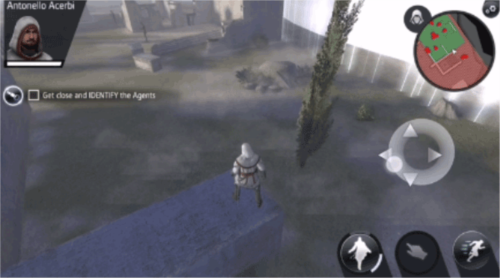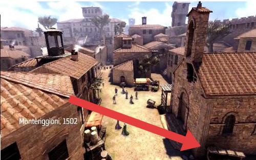 3、在Monteriggioni,1502场景中(箭头指向区域),利用屋顶等地形移动,观察下方敌人与道具,规划冒险路径。
