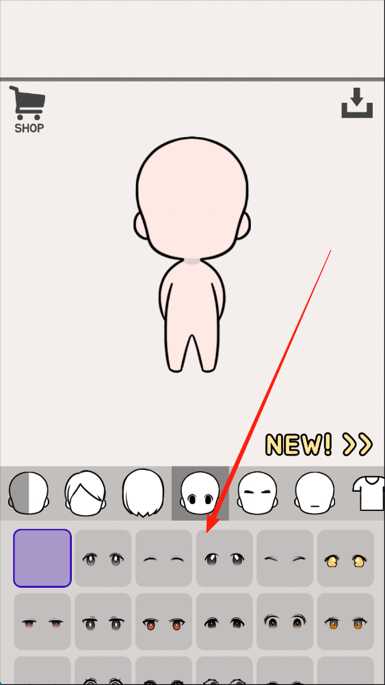 2、在角色装扮界面,从下方素材栏中选择眼睛部件,为初始角色添加眼部特征。