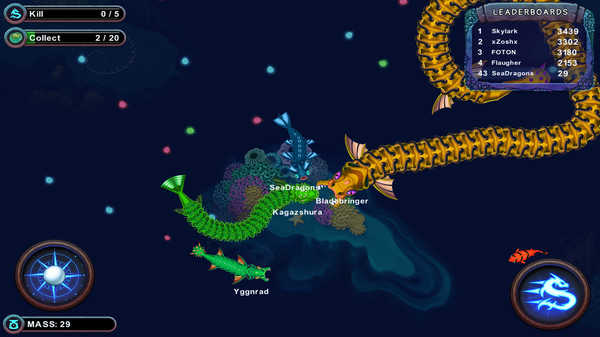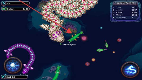 1、游戏中留意屏幕上方【Kill】和【Collect】目标,操控角色靠近【SeaDragon】等生物,通过攻击完成击杀任务,收集物品提升分数。