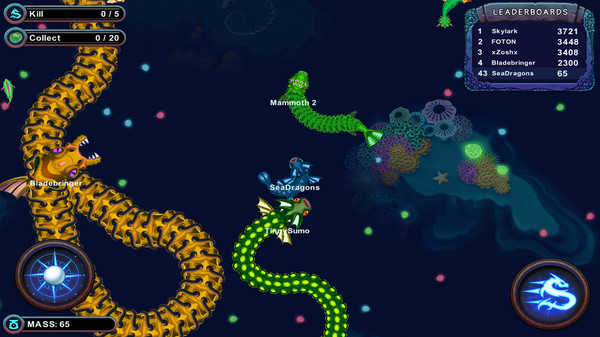 3、在海底场景中,持续收集散落在各处的物品,提升【MASS】数值增强实力,攻击并吞噬小型生物,不断提升游戏排名。